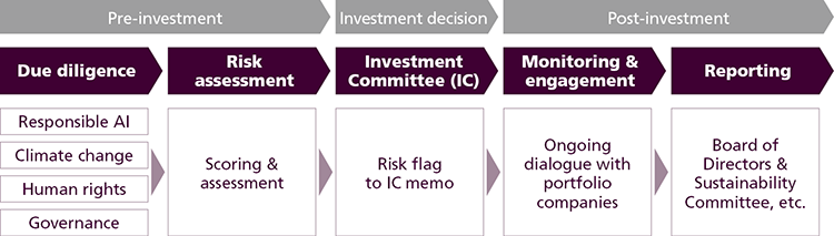 In consideration of its importance to the international community and the Group’s investment business, SoftBank Vision Funds have identified four key themes to be assessed prior to investment: responsible AI, climate change, human rights (forced labor; discrimination and harassment) and governance. SoftBank Vision Funds assess how these themes are addressed by potential portfolio companies through due diligence, assess the associated risks, and incorporate the findings into their investment decisions. SoftBank Vision Funds review the important themes and assessment methods as necessary in response to changes in their external environment and business strategies, and reflect the latest sustainability issues and assessment perspectives.