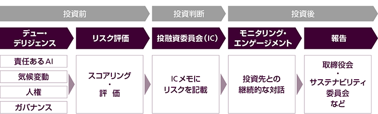 国際社会や当社グループの投資事業における重要性に鑑み、「責任あるAI」「気候変動」「人権(強制労働、差別・ハラスメント)」「ガバナンス」を投資前評価における重要トピックスとし、投資先候補におけるこれらの対応状況をデュー・デリジェンスを通じて確認し、リスクを評価して、その結果を投資判断に活用しています。なお、重要トピックスや評価方法については、外部環境や事業戦略の変化に応じて適宜見直しを行い、最新のサステナビリティ課題や評価観点を反映しています。